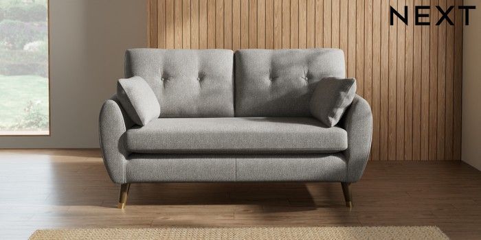 7.2.10 Wilson Buttoned Back 2 Seater Sofa Tweedy Chenille Mid Grey Low Retro Tapered Metal Cap - Mid | Made Click here to use our website with more accessibility support, for example screen readers
