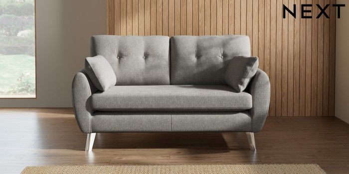 7.2.10 Wilson Buttoned Back 2 Seater Sofa Tweedy Chenille Mid Grey Metal Tapered - Chrome | Made Click here to use our website with more accessibility support, for example screen readers