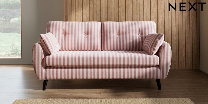 7.2.10 Wilson Buttoned Back 3 Seater Small Sofa Bold Chenille Stripe Dark Pink Retro Tapered - Dark | Made Click here to use our website with more accessibility support, for example screen readers