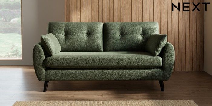7.2.10 Wilson Buttoned Back 3 Seater Small Sofa Boucle Chenille Dark Moss Green Retro Tapered - Dark | Made Click here to use our website with more accessibility support, for example screen readers