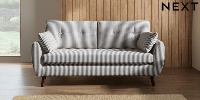 7.2.10 Wilson Buttoned Back 3 Seater Small Sofa Chenille Stripe Slate Blue Retro Tapered - Dark Brown | Made Click here to use our website with more accessibility support, for example screen readers