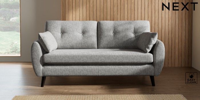 7.2.10 Wilson Buttoned Back 3 Seater Small Sofa Chunky Boucle Easy Clean Light Grey Retro Tapered - Dark | Made Click here to use our website with more accessibility support, for example screen readers