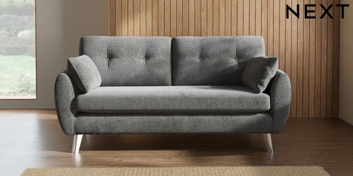 7.2.10 Wilson Buttoned Back 3 Seater Small Sofa Chunky Chenille Dark Grey Metal Tapered - Chrome | Made Click here to use our website with more accessibility support, for example screen readers
