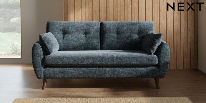 7.2.10 Wilson Buttoned Back 3 Seater Small Sofa Chunky Chenille Dark Navy Blue Retro Tapered - Mid | Made Click here to use our website with more accessibility support, for example screen readers