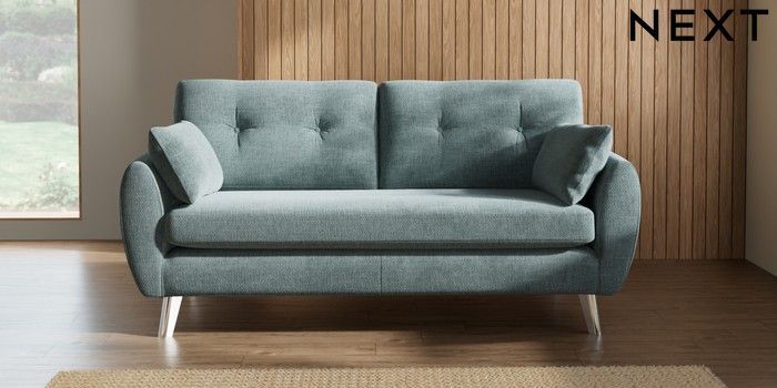 7.2.10 Wilson Buttoned Back 3 Seater Small Sofa Chunky Chenille Light Teal Green Metal Tapered - Chrome | Made Click here to use our website with more accessibility support, for example screen readers