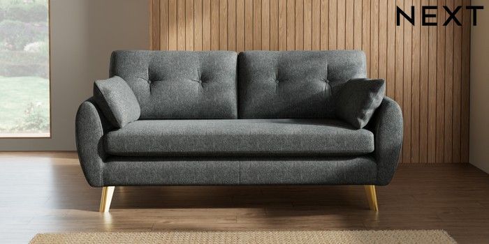 7.2.10 Wilson Buttoned Back 3 Seater Small Sofa Cotswold Chenille Dark Grey Metal Tapered - Gold | Made Click here to use our website with more accessibility support, for example screen readers
