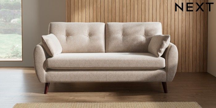 7.2.10 Wilson Buttoned Back 3 Seater Small Sofa Cotswold Chenille Light Natural Retro Tapered - Dark Brown | Made Click here to use our website with more accessibility support, for example screen readers