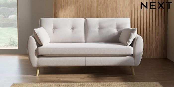 7.2.10 Wilson Buttoned Back 3 Seater Small Sofa Cotswold Chenille Oyster Retro Tapered - Light | Made Click here to use our website with more accessibility support, for example screen readers