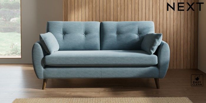 7.2.10 Wilson Buttoned Back 3 Seater Small Sofa Fine Chenille Easy Clean Mid Blue Retro Tapered - Mid | Made Click here to use our website with more accessibility support, for example screen readers