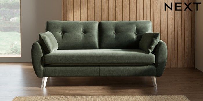7.2.10 Wilson Buttoned Back 3 Seater Small Sofa Luxe Chenille Mid Green Metal Tapered - Chrome | Made Click here to use our website with more accessibility support, for example screen readers