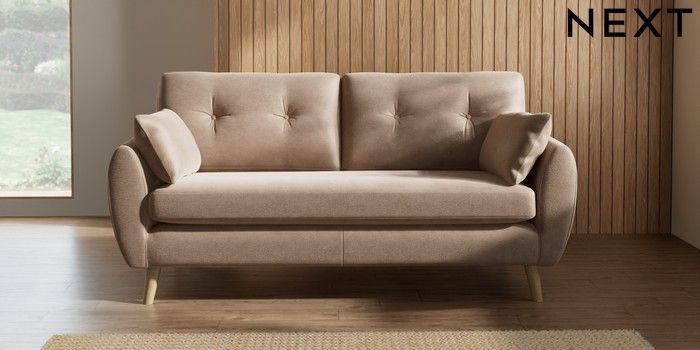 7.2.10 Wilson Buttoned Back 3 Seater Small Sofa Luxe Chenille Mid Natural Retro Tapered - Light | Made Click here to use our website with more accessibility support, for example screen readers