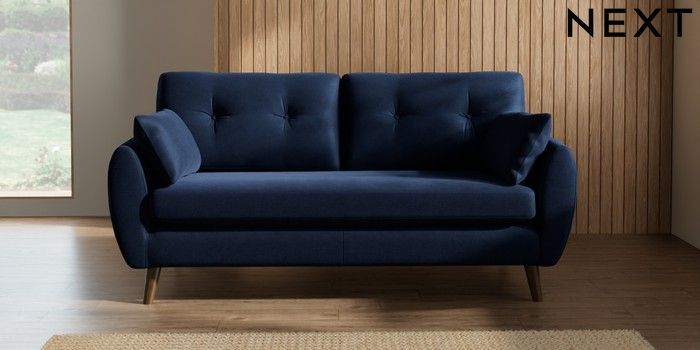 7.2.10 Wilson Buttoned Back 3 Seater Small Sofa Luxe Chenille Navy Blue Retro Tapered - Mid | Made Click here to use our website with more accessibility support, for example screen readers