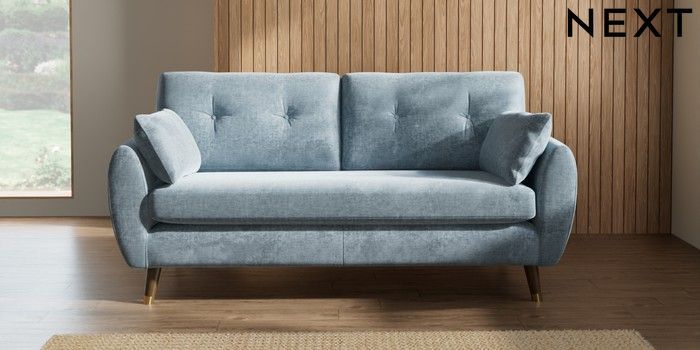 7.2.10 Wilson Buttoned Back 3 Seater Small Sofa Plush Chenille Light Blue Low Retro Tapered Metal Cap - Mid | Made Click here to use our website with more accessibility support, for example screen readers