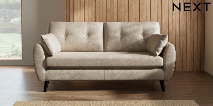 7.2.10 Wilson Buttoned Back 3 Seater Small Sofa Plush Chenille Light Natural Retro Tapered - Dark | Made Click here to use our website with more accessibility support, for example screen readers