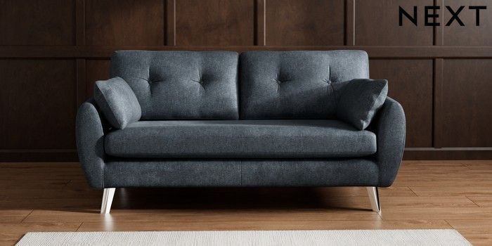 7.2.10 Wilson Buttoned Back 3 Seater Small Sofa Plush Chenille Slate Blue Metal Tapered - Chrome | Made Click here to use our website with more accessibility support, for example screen readers