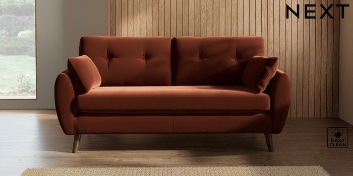 7.2.10 Wilson Buttoned Back 3 Seater Small Sofa Plush Velvet Easy Clean Ginger Orange Retro Tapered - Mid | Made Click here to use our website with more accessibility support, for example screen readers