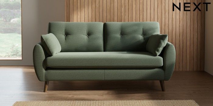 7.2.10 Wilson Buttoned Back 3 Seater Small Sofa Relaxed Linen Look Dark Green Retro Tapered - Mid | Made Click here to use our website with more accessibility support, for example screen readers