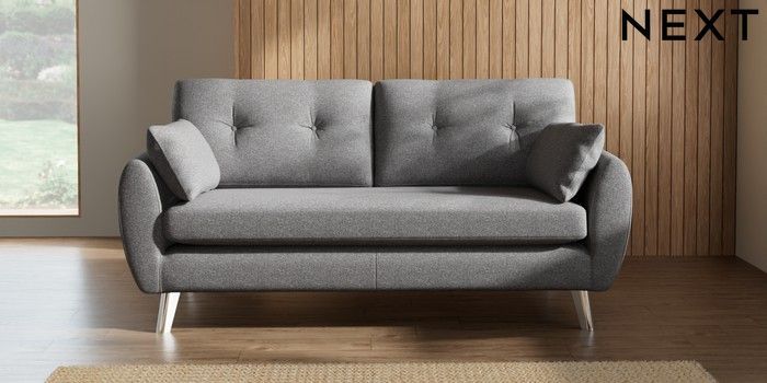 7.2.10 Wilson Buttoned Back 3 Seater Small Sofa Studio Chenille Mid Grey Metal Tapered - Chrome | Made Click here to use our website with more accessibility support, for example screen readers