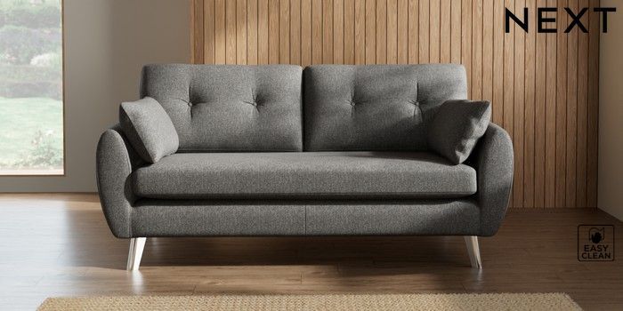 7.2.10 Wilson Buttoned Back 3 Seater Small Sofa Tweedy Blend Easy Clean Dark Grey Metal Tapered - Chrome | Made Click here to use our website with more accessibility support, for example screen readers