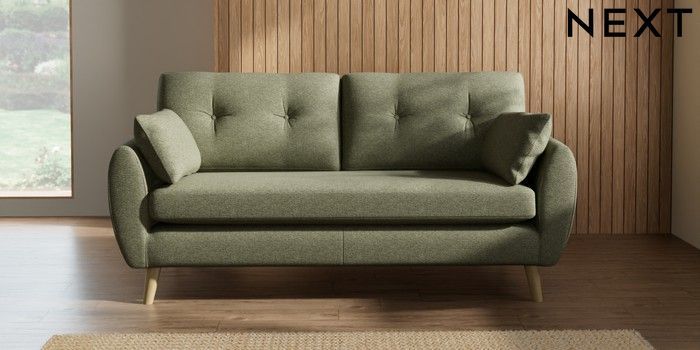 7.2.10 Wilson Buttoned Back 3 Seater Small Sofa Tweedy Chenille Mid Moss Green Retro Tapered - Light | Made Click here to use our website with more accessibility support, for example screen readers