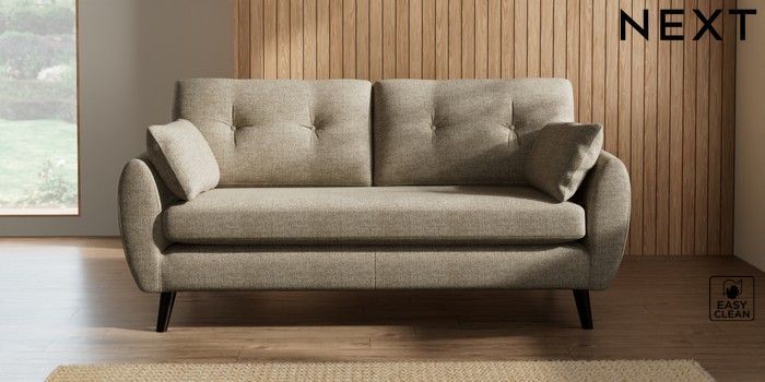 7.2.10 Wilson Buttoned Back 3 Seater Small Sofa Woven Chenille Easy Clean Mid Natural Retro Tapered - Dark | Made Click here to use our website with more accessibility support, for example screen readers