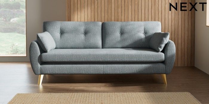 7.2.10 Wilson Buttoned Back 3 Seater Sofa Chunky Weave Mid Blue Metal Tapered - Gold | Made Click here to use our website with more accessibility support, for example screen readers