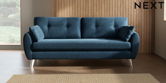 7.2.10 Wilson Buttoned Back 3 Seater Sofa Cotswold Chenille Dark Blue Metal Tapered - Chrome | Made Click here to use our website with more accessibility support, for example screen readers