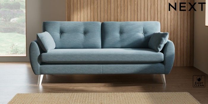 7.2.10 Wilson Buttoned Back 3 Seater Sofa Fine Chenille Easy Clean Mid Blue Metal Tapered - Chrome | Made Click here to use our website with more accessibility support, for example screen readers