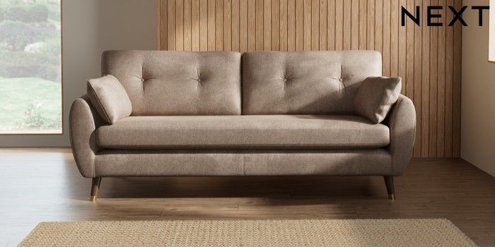 7.2.10 Wilson Buttoned Back 3 Seater Sofa Plush Chenille Mid Natural Low Retro Tapered Metal Cap - Mid | Made Click here to use our website with more accessibility support, for example screen readers