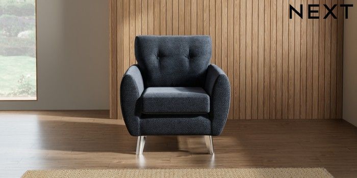 7.2.10 Wilson Buttoned Back Armchair Boucle Chenille Dark Slate Blue Metal Tapered - Chrome | Made Click here to use our website with more accessibility support, for example screen readers