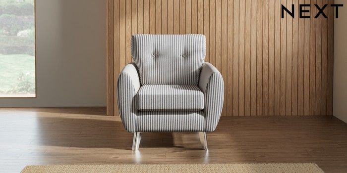 7.2.10 Wilson Buttoned Back Armchair Chenille Stripe Slate Blue Metal Tapered - Chrome | Made Click here to use our website with more accessibility support, for example screen readers