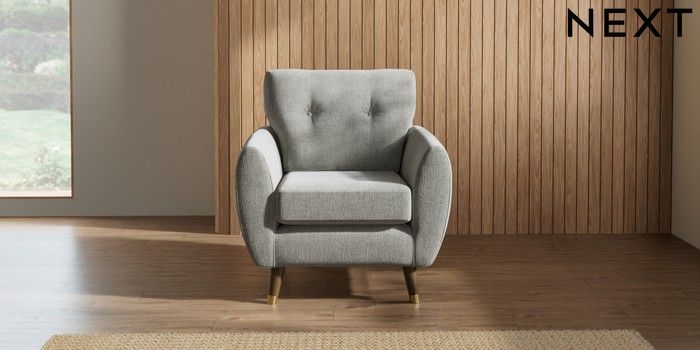 7.2.10 Wilson Buttoned Back Armchair Chunky Chenille Light Grey Low Retro Tapered Metal Cap - Mid | Made Click here to use our website with more accessibility support, for example screen readers