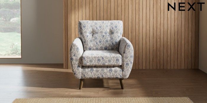 7.2.10 Wilson Buttoned Back Armchair Relaxed Linen Look Print Woodblock Floral Blue Retro Tapered - Mid | Made Click here to use our website with more accessibility support, for example screen readers