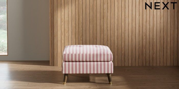 7.2.10 Wilson Buttoned Back Footstool Bold Chenille Stripe Dark Pink Low Retro Tapered Metal Cap - Mid | Made Click here to use our website with more accessibility support, for example screen readers
