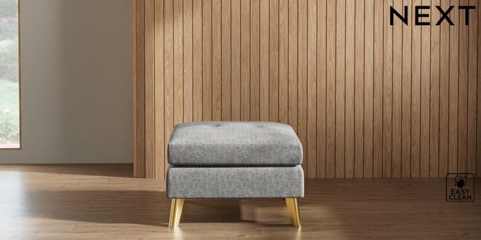7.2.10 Wilson Buttoned Back Footstool Chunky Boucle Easy Clean Light Grey Metal Tapered - Gold | Made Click here to use our website with more accessibility support, for example screen readers