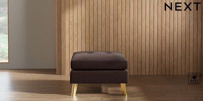 7.2.10 Wilson Buttoned Back Footstool Fine Chenille Easy Clean Chocolate Brown Metal Tapered - Gold | Made Click here to use our website with more accessibility support, for example screen readers