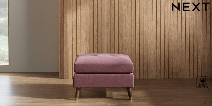 7.2.10 Wilson Buttoned Back Footstool Fine Chenille Easy Clean Mid Mulberry Purple Low Retro Tapered Metal Cap - Mid | Made Click here to use our website with more accessibility support, for example screen readers