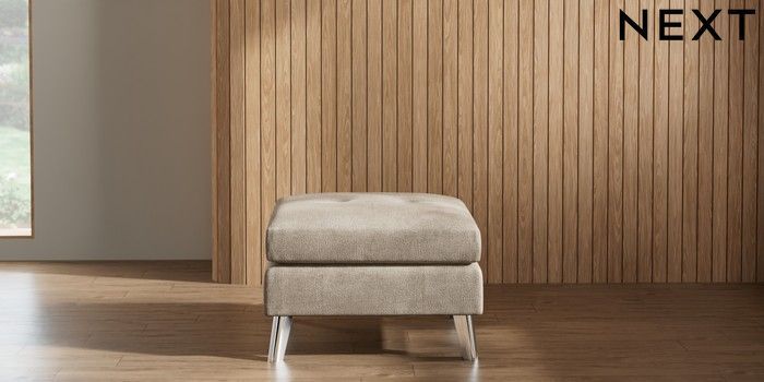 7.2.10 Wilson Buttoned Back Footstool Plush Chenille Light Natural Metal Tapered - Chrome | Made Click here to use our website with more accessibility support, for example screen readers