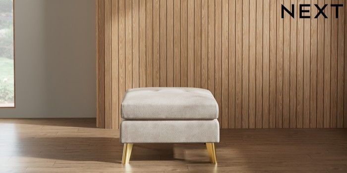 7.2.10 Wilson Buttoned Back Footstool Plush Chenille Oyster Metal Tapered - Gold | Made Click here to use our website with more accessibility support, for example screen readers