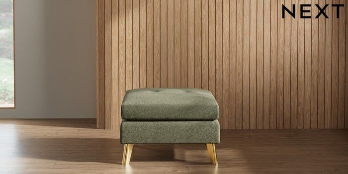 7.2.10 Wilson Buttoned Back Footstool Tweedy Chenille Mid Moss Green Metal Tapered - Gold | Made Click here to use our website with more accessibility support, for example screen readers