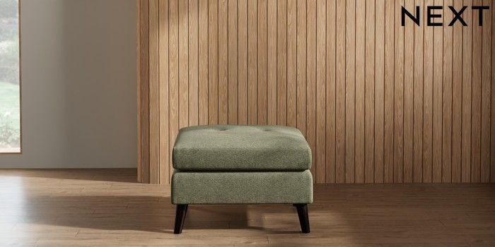 7.2.10 Wilson Buttoned Back Footstool Tweedy Chenille Mid Moss Green Retro Tapered - Dark | Made Click here to use our website with more accessibility support, for example screen readers