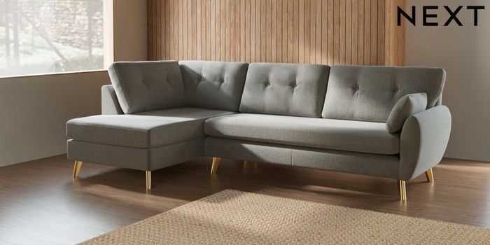 7.2.10 Wilson Buttoned Back Large Corner Chaise - Left Hand Chunky Texture Dove Metal Tapered - Gold | Made Click here to use our website with more accessibility support, for example screen readers