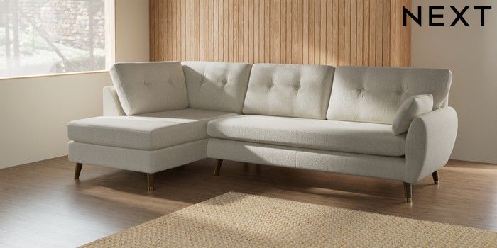 7.2.10 Wilson Buttoned Back Large Corner Chaise - Left Hand Chunky Texture Oyster Low Retro Tapered Metal Cap - Mid | Made Click here to use our website with more accessibility support, for example screen readers