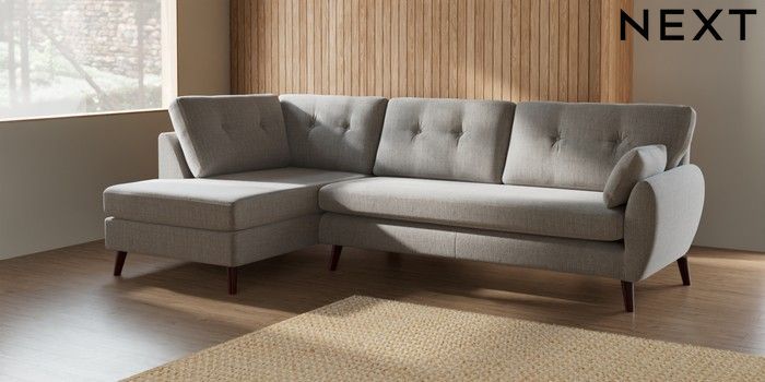 7.2.10 Wilson Buttoned Back Large Corner Chaise - Left Hand Chunky Weave Dove Grey Retro Tapered - Dark Brown | Made Click here to use our website with more accessibility support, for example screen readers