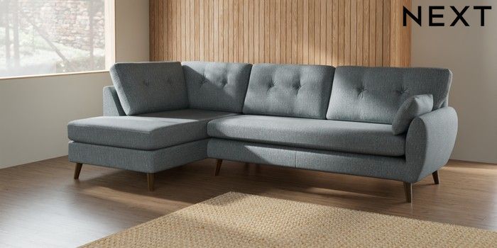 7.2.10 Wilson Buttoned Back Large Corner Chaise - Left Hand Chunky Weave Mid Blue Retro Tapered - Mid | Made Click here to use our website with more accessibility support, for example screen readers