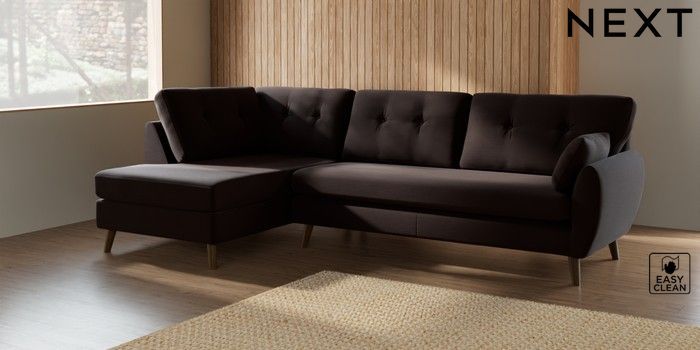7.2.10 Wilson Buttoned Back Large Corner Chaise - Left Hand Fine Chenille Easy Clean Chocolate Brown Retro Tapered - Mid | Made Click here to use our website with more accessibility support, for example screen readers