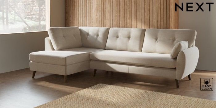 7.2.10 Wilson Buttoned Back Large Corner Chaise - Left Hand Fine Chenille Easy Clean Oyster Retro Tapered - Mid | Made Click here to use our website with more accessibility support, for example screen readers