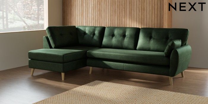 7.2.10 Wilson Buttoned Back Large Corner Chaise - Left Hand Luxe Chenille Dark Green Retro Tapered - Light | Made Click here to use our website with more accessibility support, for example screen readers