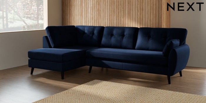 7.2.10 Wilson Buttoned Back Large Corner Chaise - Left Hand Luxe Chenille Navy Blue Retro Tapered - Dark | Made Click here to use our website with more accessibility support, for example screen readers