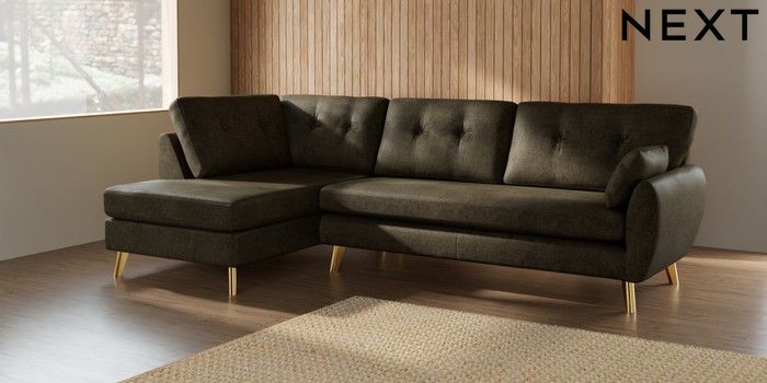 7.2.10 Wilson Buttoned Back Large Corner Chaise - Left Hand Plush Chenille Moss Green Metal Tapered - Gold | Made Click here to use our website with more accessibility support, for example screen readers